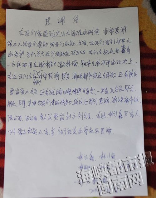 德化县委书记县长带头捐款 林让鑫承诺剩款返捐 新闻回顾>>> 德化血癌妈妈拼命生早产儿 30万医药费让这家走投无路  林让鑫写的感谢信 东南网5月2日讯(海峡都市报记者 陈晓婷 田米 文/图)绝望的悬崖上开出的那朵希望之花,总是让人热泪盈眶。这几天,这希望的花朵,在德化林让鑫的心间,迅速成长。肺癌晚期的母亲,白血病的妻子,重症室里的早产儿,他终于有了面对的勇气。 昨天,爱心人士的捐款,已经帮妻子和儿子凑够了医药费,但涌动的爱心没有停下来:截至昨日下午6点,林让鑫已收到爱心款345946.69元,这还不包括德化憨鼠爱心小分队代收的、尚未转交的7.1万元。 林让鑫家的遭遇,经海都报连续两天的报道,还引来了德化县县委书记吴深生、县长欧阳秋虹的关注,他们在开会时发动捐款,募集了2万多元,并转交给憨鼠小分队。 为了感谢大家的帮助,林让鑫昨天写了一封感谢信,“我的字很丑,但是就想谢谢大家”。 弟弟好了后,我帮他换纸尿裤 “她一直吵着要看弟弟要看弟弟,没办法,只好带她过来。”昨日下午4点,林让鑫带着6岁的女儿小雨,到医院看早产的弟弟洋洋。洋洋闭着眼睛睡觉,小雨显然对弟弟的“不热情”有点不满意。 不过,小家伙并没有跟弟弟一般见识,很快,她又开心地说,“弟弟长得很帅,跟我一样好看”。小雨指着自己的鼻子说,弟弟的鼻子不像她的这么扁,比她的好看。天真的小雨告诉记者,她现在常常用洋娃娃练习包纸尿裤,等弟弟出来后,要帮他换纸尿裤。 乖巧的女儿,给了林让鑫夫妇不少安慰。同样让他们感动的,还有爱心人士的关心。“家里很多牛奶、面线,都是好心人带来的。”林让鑫的妻子林小菊说,这些有的是登门来看望,有的是托人带来的。 昨天,林让鑫的银行卡、微信,又多了不少进账,爱心款已经超过原先预计的30万元医药费。“告诉大家不用再捐了,这已经能够帮我们渡过这个难关了。”林让鑫说,希望大家把钱捐给更需要的人,接下来,如果家人的医药费不够,他会再想办法去筹。 |