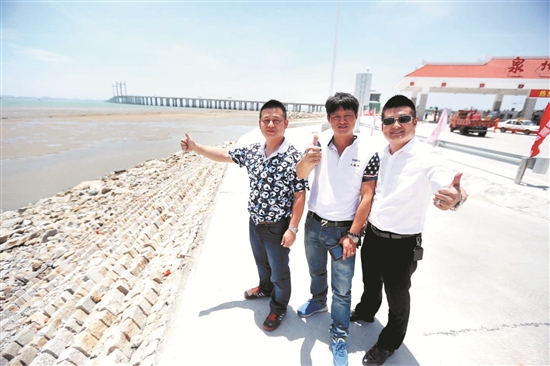 昨晚9:40许,记者用相机长时间曝光拍摄,穿梭的车流把大桥装扮得流光溢彩 (王柏峰 吴嘉晓/摄) 昨日下午,记者跟随泉州高速交警支队四大队民警到新开通的泉州湾大桥巡逻,路上的车辆都在慢慢开,看来大家都在边走边看新鲜、赏风景。据统计,自12日中午12时正式通车至昨日中午12时,一天的时间共有6892车次通行大桥。 □早报记者 林志安 吴嘉晓 通讯员 尤泳尧 文/图 两车在桥上“漫步” 被交警喊话 昨日下午5时许,记者跟随高速交警从晋江南收费站上高速路,沿晋石高速往石狮方向连接新开通的泉州湾大桥巡逻,路面上车辆并不多。“统计一下,开通后的24小时共6892车次,什么概念呢?沈海高速泉州段平时车流量一天8万多。”高速交警说。 一路上警车保持时速90km左右,两旁少有车辆超车。“估计大家都还在新鲜劲头上,边开边看看风景,不过速度慢点是对的,桥上风比较大,车速不要太快。”高速交警说。 在大桥上,民警发现一辆小车在最右侧车道和应急车道之间“漫步”,似有停车逗留的迹象,遂通过喊话器,及时告知桥上不能停车,让其赶紧开走。 在泉州东(秀涂港)出口匝道口处,一辆小车在高速车道和匝道之间摇摆不定,不知是要出高速还是继续前行,高速交警喊话后,小车马上转入匝道驶出高速路。高速交警表示:高速出入口匝道口是事故易发点,驾驶员要从哪里出高速,路线应事先规划好,错过出口,就继续往前开,到下一个出口下高速。  高清探头拍摄,车牌号清晰可见 高清探头可放大20倍 沥青纹路都看得见 12日正式通车后不久,就有一辆车停在大桥应急车道上,车上人员下车拍照,结果被高速交警巡逻查个正着,面临扣6分的处罚。 不被交警逮到不就行了嘛!您是不是这么想的呢?跟您说哦,整个路段每隔1公里就有一个高清探头,每辆经过的车都会出现在画面里,画面实时传送到监控中心。 高清探头到底有多高清呢?记者来到福建省高速公路泉州管理分公司晋江监控分中心的监控室。“可以放大20倍。”工作人员边操作边说,记者看到,放大后探头可以将路面的沥青拍得很清楚,路上的路桩标号也一样,更别说车辆的牌号了。 高速交警表示,一旦发现车辆在路面上违停,只要拉近镜头,将画面截图下来,就可以作为交通违法处罚依据。您还有侥幸心理吗?不想被处罚的话,还是规矩点吧。 相关新闻: 娘家在这头 婆家在那头 上桥回家路更近  从石狮上桥体验一把,在秀涂拍照留念 (庄丽祥/摄) □早报记者 林志安 李心雨 许奕梅 柯丽娟 赵鹏云 实习生 苏景宏 12日中午12时,泉州湾大桥正式通车,大大拉近石狮、晋江与台商投资区、惠安的距离。大桥通车前后,早报记者兵分三路,分别在三个收费站记录下人们激动的心情,分享他们曾经隔海相望的故事。 惠安的龚女士,她的娘家和婆家在大桥两头,大桥通车后,回家的路更近了;石狮的纪爷爷说,他在家门口隔海望对岸望了几十年,总算要到那边去看看了。 大桥两头都是家 回家时间缩短一半 “走上泉州湾大桥,一头是娘家,一头是婆家,现在我妈喊我回家吃饭,我也能随叫随到了。”龚女士是惠安东岭人,嫁到石狮市区,以前要回趟娘家,算上路上堵车等红绿灯,要花去1个多小时的时间。而泉州湾大桥通车后,她只要半个小时就能到家。 “可能我都到娘家了,我妈还没煮好饭呢。”龚女士上桥体验后很兴奋,“那感觉棒极了,泉州海湾尽收眼底,作为泉州人很自豪。” 曾上桥30余次 亲历大桥建成 家住泉州台商投资区东园镇阳光村、今年64岁的王老伯,在通车当天上午6时多就步行上桥,别提多开心。 王老伯的家离大桥不远,他最早一次上大桥的时候大桥还在搭架,此后他先后30多次上桥,看着大桥一天天建成,直至通车。 “大桥建好对我们来说太方便了。”王老伯说,他的女儿嫁到桥那头的石狮,那里也有他们王氏的宗亲,以后往来更方便。 在阳光村,开心的不止王老伯一人。88岁的江金土可算是来参观大桥通车最年长的了,他和大儿子、曾孙女一家四代一起来看桥,特意在大桥入口合影留念。而他的同村朋友、84岁的江老伯也在儿媳妇陪伴下过来了。“跨海大桥在全国都是少见的,泉州能建起来,太不容易了。”江金土说。 先骑摩托车来围观 再开小车体验 前天上午9时40分左右,在泉州湾大桥台商区(张坂)收费站处,谢先生骑着一辆女式摩托车,载着他的朋友笑盈盈地来了。谢先生说,他是附近东园镇的村民,泉州湾大桥还在建设的时候,就觉得非常漂亮、壮观,他经常到大桥附近转转,看看风景。 “我们是通过东南早报的相关报道知道泉州湾大桥将通车的。”谢先生告诉记者,趁大桥还没有正式通车,他先骑着摩托车过来看看,等大桥通车后,他还会再开车上来体验。 80多岁老爷爷 终于来到海的那一边 前日上午11时许,40多岁的纪先生,载着80多岁的老父亲来到石狮北(石湖港)收费站,排队等待泉州湾大桥通车,随行的还有他的妻子和他4岁多的侄子,以及父亲的一个老朋友。 “从我家门口望过去就是台商投资区,那边隔着一片海,还不曾去过。”80多岁的纪爷爷说,泉州湾大桥开通,他特地让儿子开车,载他“抢鲜”体验,三代同堂,到他不曾去过的海的那边看看。 |