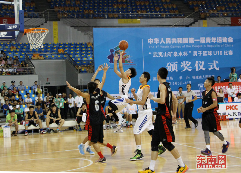 首届青运会男子篮球U16比赛冠军争夺战现场。