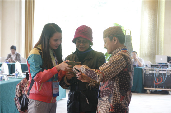 青年志愿者帮助外宾通过手机了解文化论坛相关信息