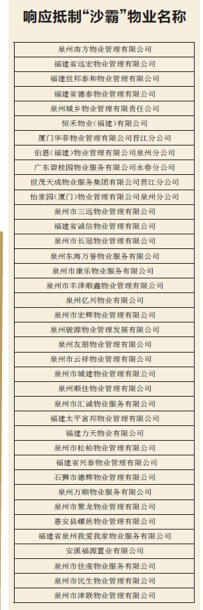 ■丰泽区委政法委: 成立工作协调小组 重点摸排新小区 为确保打击整治工作顺利进行,丰泽区成立治理“沙霸”、“搬霸”工作协调领导小组,召开专项部署动员会,对打击整治工作进行周密部署,并起草制定《丰泽分局打击建筑领域黑恶势力违法犯罪活动应急处置方案》,重点打击“沙霸”、“搬霸”强买强卖、强揽工程等强迫交易的违法犯罪行为。 针对媒体报道涉及“沙霸”、“搬霸”问题的,由区委政法委牵头,从5月底到6月底集中开展为期1个月的治理专项行动,对全区的小区楼盘进行全面摸底排查,重点集中在2015年以来竣工备案的16宗楼盘。区住建局向物业发放倡议书,要求物业不得设定进场装修条件,不得以任何理由收取“沙霸”、“搬霸”进场费或场地使用费。一经发现物业违反,将按照相关规定予以严肃处理,同时将在其信用体系中予以扣分并向社会公布。全区8个街道已成立打击“沙霸”、“搬霸”等违法犯罪行为工作领导组,对“沙霸”、“搬霸”等行为开展重点整治。工商、税务、物价、公安等部门联合行动,建立长效机制,严查无证经营、偷税漏税、哄抬物价、恐吓威胁业主等违法行为。 下一步,将由区委政法委牵头,丰泽公安分局、住建局协同行动,对全区交房新楼盘进行进一步深入摸排,发现有欺行霸市、强买强卖的违法情况,立即打击整顿;鼓励受“沙霸”、“搬霸”侵害的市民及知情人士向公安机关举报;强化对物业的规范管理和秩序建设,建立奖惩机制,逐步完善系统、规范的物业管理秩序。 目前,丰泽区社区民警已深入小区与物业管理人员座谈交流,向新装修的业主宣讲相关法律法规,张贴发放警方温馨提示4000多份,鼓励广大群众积极参与举报、主动举证,配合警方共同查处“沙霸”、“搬霸”。 丰泽区已设立举报电话:22597110(丰泽公安分局)、22524186(丰泽区住建局)。 ■市物业管理协会: 38家物业公司表态 坚决抵制“沙霸” 打击“沙霸”“搬霸”,物业公司责无旁贷。昨日,记者从泉州市物业管理协会处了解到,为提升物业管理行业形象,打击物业小区的“沙霸”、“楼霸”强买强卖、损害业主利益问题,泉州市物业管理协会日前发出抵制“沙霸”、“楼霸”倡议书,号召会员单位积极响应。 该倡议书提到,物业服务企业不收取沙、土买卖进场费用或场地使用费用;加强内部管理,设立企业24小时监督投诉热线;物业服务中心不在小区红线内公共场所提供任何摆放沙土、水泥的摊点;加强内部宣传与教育,严令物业服务人员不参与、不引导、不指定、不介绍沙土、水泥买卖等。 倡议书发出至今,市物业管理协会120家会员单位里,有38家单位已在倡议书上盖章(详见下表)。 如果您所在的小区存在与“沙霸”、“搬霸”勾结的行为,欢迎您拨打本社24小时热线96339举报,或在“泉州晚报”官方微信上留言。本报将把您的情况反馈给相关部门。 ![]() |