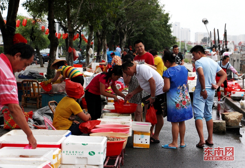 台风登陆后,泉州江滨路上一些小摊贩正利用无雨的间隙在路边摆摊售鱼。