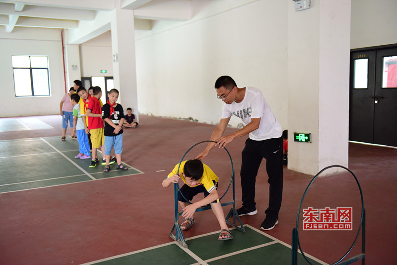 陈垂应老师(右一)正在给孩子们上体育课 “目前比较难教的是自闭症的孩子,他们语言能力、运动能力、感知能力等会差些,对老师而言是极大的挑战。”王芳告诉记者,随着医学技术的进步,聋人孩子越来越少了,而以往被社会忽视的自闭症孩子却越来越多了。学校从2014年开始招收自闭症的孩子,虽然有的自闭症孩子智商也不低,但是整个教学过程却十分艰难,非常考验教师的专业性。 在学校的室内体育场内,陈垂应老师正在给孩子们上体育课。残疾孩子,尤其是脑瘫孩子的身体锻炼特别重要,如果不锻炼,肌肉会日渐萎缩。当天体育课的一项内容是要求孩子们钻过两个大圈。当孩子手足无措地站在大圈面前时,陈老师首先告诉他,用脚先跨过去,孩子听不懂后,他又用闽南语重复了一遍,孩子仍然没反应。他自己亲身示范,用脚跨过去,孩子仍然无动于衷,他用手轻轻地将孩子的脚往圈内放。从语言提示到身体示范,再到直接协助,这是一个由难及易的渐变的教学过程,需要很大的耐心。 |
