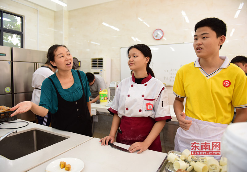 闵淑萍老师(左一)正指导学生们制作中秋月饼 中秋节快到了,在高职班的烘焙教室内,香气四溢,孩子们正在做月饼。职高教研组组长闵淑萍老师一会儿用手语指导着聋生,一会儿督促学生不要分散注意力,还要注意教室内的刀具,以及时不时想要开门的自闭症孩子。如此劳心费神的教学过程,有着多年教学经验的闵淑萍早已驾轻就熟。 王芳告诉记者,学校的职业教育除了烘焙课,还有烹饪、缝纫、美发等多种课程。“不求他们做到很专业,但是至少能实现生活自理,给家庭和社会减少负担,这也是我们特殊教育的最终目的。” |
