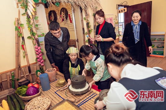特色主题走馆活动中,孩子在体验磨豆浆。 石狮市快乐贝林幼儿园 供图