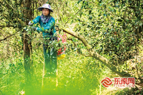 永春县桃城镇洋上村的玳瑁山,戴着斗笠的女工站在梯子上端,娴熟采摘茶叶。潘敏星 摄 走遍10多个乡镇,寻找有文化味的原始茶园 “家乡山高林密,生产出的茶叶质量高,早就名闻遐迩,还是全国乌龙茶出口生产基地县、最大佛手茶生产出口基地县、闽南水仙茶发源地和最大生产基地。”黄茂德解释了回乡的缘由。 一回到家乡,他便四处打听闲置的茶园,先后到一都、达埔、外山等10多个乡镇看过,但与其设定的目标相距甚远。在一次偶然机会,有朋友告诉他,桃城镇洋上村有一片种植于上个世纪20年代的水仙茶园,上个世纪60年代,获得“全国三八红旗手”的鲁辽妇女耕山队继续开荒种植水仙茶,后长年荒废,早已淹没在山草中。 一听到这消息,黄茂德十分兴奋,他早就知道洋上村是乡愁诗人余光中的故乡,而玳瑁山的悠久历史和茶园的原始风情,更让他深为着迷。 踏破铁鞋无觅处,得来全不费工夫。无意中得到的消息,让他欣喜若狂。他立即驱车到洋上村,在村民的带路下,朝着茶园的大致方位进发,但山高林密,荒草丛生,压根就没看到茶树。 看着莽莽林海,黄茂德并没有气馁,继续拿着斧头、镰刀等工具,索性自己上山查找茶园,拔开杂草探个究竟。他从半山腰前行数十米,一次次落空了。但他顾不上荆棘,继续前行,忽然看到一大株高过个头的草丛,绿叶的形状明显与杂草不同,这让他心神一振。他小心翼翼地挑去多余的“外衣”,半个小时后,一株两人高的水仙茶树完全呈现在他的面前。由于常年被杂草侵袭,缺乏阳光滋润,茶树树干枯瘦,树叶稀松无力。尽管如此,他得到了极大慰藉,很快就在旁边相继找到了第二棵、第三棵…… 一洗之前的劳累,他轻快地回到洋上村部,向村两委成员表达了自己要承包开发这片古老茶园的意愿。不久后,他如愿以偿,成为该片茶园的新主人。 |
