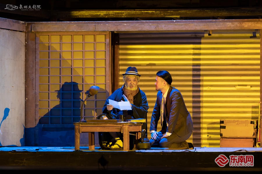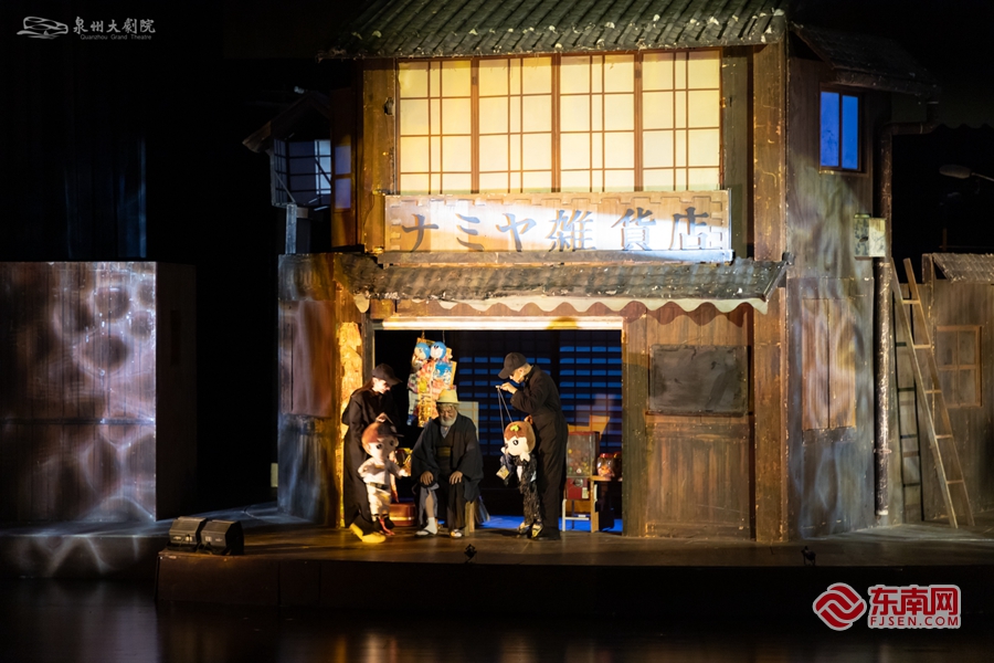 话剧《解忧杂货店》剧照。泉州大剧院 供图 东南网8月8日讯(本网记者 谢玉妹 通讯员 郑文华)8月7-8日晚,话剧《解忧杂货店》在泉州大剧院上演,这是《解忧杂货店》首次改编中文话剧在中国演出。 中文话剧《解忧杂货店》改编自日本作家东野圭吾的同名小说,由刘方祺导演,历经一年多的筹备,最终将原小说中90%的内容呈现出来。东野圭吾特地为这部话剧题词,这也是他首次为中文版话剧亲笔题词。 总导演刘方祺曾执导过《三体》舞台剧和《盗墓笔记》系列舞台剧,擅于运用高科技打造酷炫的舞台效果。然而这一次,他却选择了《解忧杂货店》这样的治愈系话剧,回归最质朴的舞台表达。 话剧 《解忧杂货店》讲的是一个时空交错的故事,为此,演出舞台上专门搭建了一个完整的“解忧杂货店”,通过旋转舞台360度呈现各种各样的细节,同时把过去的时空和现在的时空勾连起来,让观众眼前一亮。为了在有限的空间承载剧中多幕场景的变换。舞台上的每一处布景都暗藏玄机,比如,三个小偷脚下的榻榻米就设置了6个机关,可以快速进行场景变化。 《解忧杂货店》的音乐也十分让人惊喜,大部分的音乐及声音效果都来自于现场演奏。演出过程中总共使用了20多种乐器,包括传统的日本乐器三味线等,部分乐器由大草专程从日本购来。剧中每个人物都拥有不同主题的音乐,不同的故事也采用不同的乐器组合来表达,渲染出细腻的情感变化。 为了接近书中人物的形象,每个人物从人物造型设计到表演方式,都经历了精雕细琢的打磨。所有演员都在排练过程中接受了来自日本相关专业人士的辅导,学习日常的日语口语及日本文化礼仪课程,将书中描述的日本小镇宁静气息尽可能原汁原味地传达给现场观众。话剧版还将特别增加日语字幕,目的是同时邀请在中国的、喜爱这部作品的日本观众也能够走进剧场一起感受中国话剧魅力。