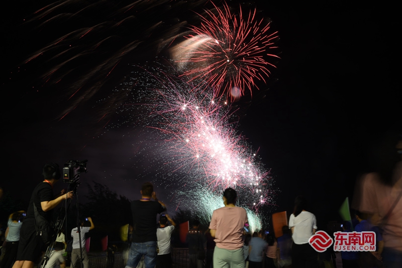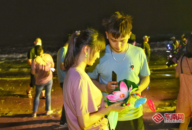 当晚绚丽的焰火。吴晓毅 摄 东南网8月26日讯(本网记者 陈诗婷 通讯员 程青)25日晚,作为第六届海峡两岸七夕返亲节的重要配套活动,以“同心·相望”为主题的放水灯祝福祈愿及焰火表演在晋江市金井镇围头月亮湾沙滩举行。 受到新冠肺炎疫情的影响,主办方首次采取“线上直播+线下互动”“主会场+台湾分会场”的模式,即两岸两地同时举行、网络直播连线互动,开启一场浪漫的“云”上鹊桥会。 当晚,一道道绚丽的焰火,纵情飞向夜空,灿烂绽放。与此同时,金门金湖镇,不少“围头新娘”和金门乡亲,纷纷走出活动分会场,隔海观望月亮湾的焰火表演。还有77对情侣、两岸家庭代表手捧写满祝福的祈福灯依次步入沙滩,将祈福灯放入大海,共同为两岸和平祈福。 去年荣获“全国最美家庭”,从台湾彰化来到漳浦创业的吴锡祺、曾文子夫妻参加了放祈福灯的活动。已结婚40年的他们第一次参加两岸返亲节。“今年疫情原因,已经有半年没有回台湾了。”他们表示,在福建生活特别有归属感,希望返亲节越办越好,两岸人民感情越来越深。 晋江金井围头村,是大陆距离大金门岛最近的地方,它被誉为“海峡第一村”。目前,围头村共有148对两岸夫妻,是名副其实的“两岸通婚第一村”。返亲节是两岸交流的重要项目,也是金井的一张名片,金井镇党委副书记颜艺鸿表示,焰火和放祈福灯,也是希望在两岸最近的地方,让两岸同胞共赏节日的氛围,通过返亲节这一亲情的纽带,架设两岸文化交流的桥梁。