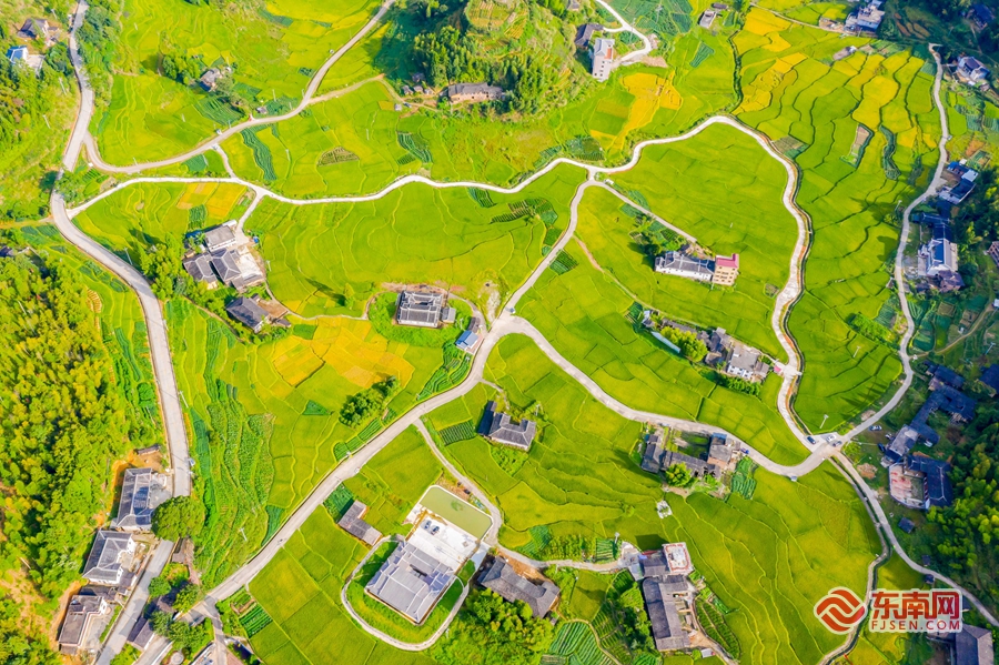 金黄的水稻与美丽村庄构成一幅精美的乡村丰收画卷。赖建明 摄