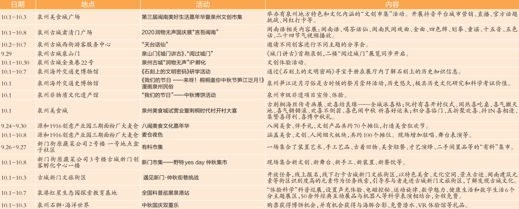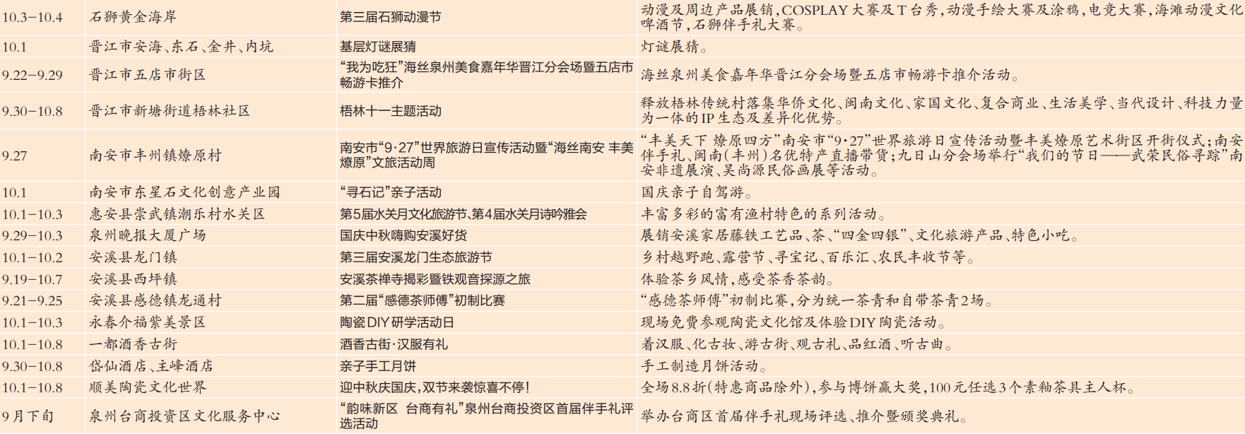 非遗体验、展示活动让更多市民、游客走近非遗。(泉州市艺术馆 供图) 动静结合 好戏连台展览多样 作为全国有名的“戏窝子”,国庆黄金周期间,泉州好戏连台,由泉州各大文艺院团带来的21项文化艺术演出将唱响温陵大地。此外,各地各单位带来的9项文化展览,将让广大市民游客在非遗、传统文化等的活态传承展示、体验中,进一步了解泉州。 非遗展、石陶古砖碑刻拓片展、老照片展、油画展、书画展……黄金周期间,有9项主题各异的文化展览不可错过。其中,由泉州晚报社、泉州网、泉州市威远楼文物保管所共同主办的中山路老照片展,通过老照片将百年中山路的历史与韵味娓娓道来,值得期待。 10月1日-10月7日,由泉州古城办在泉州旧馆驿25号举办“清源驿国庆古琴展演活动”;10月1日和3日,在南音艺苑,泉州市闽南民间歌舞传承中心将先后举办文化惠民活动之《声乐专场》和《舞蹈专场》;10月2日到7日,福建省梨园戏传承中心将连续6天为戏迷们带来梨园戏《李亚仙》《倪氏教子》《雪梅》《王魁》《朱文》《朱弁》,喜爱梨园戏的朋友们可到泉州梨园古典剧院欣赏。 泉州市提线木偶戏传承保护中心在10月1日-8日期间,每天都将有两场专场公益演出,分别是10月1日-10月8日16:00-17:00在鲤城区通政巷24号的折子戏专场;10月2日-10月6日19:30-20:30,在泉州木偶剧院(丰泽区泉山路355号)的折子戏专场。 除了中心市区,各县(市、区)也组织了丰富多彩的文艺演出,让各地市民足不出户,便可享用假日大餐。晋江市委市政府将于9月26日、27日、30日,分别带来合唱音乐会、古琴音乐会、民乐音乐会。晋江市掌中木偶艺术保护传承中心,9月28日-10月2日,将在五店市露天戏台、晋江戏剧中心带来木偶剧公益演出,具体演出剧目和时间地点安排是:《玉骨鸳鸯扇》,9月28日19;30,在五店市露天戏台;《小美人鱼——爱丽儿》,10月2日(两场),15:00、19:30,在晋江戏剧中心木偶剧场。石狮市文化馆、石狮市南音艺术家协会将组织全市南音社团大会唱演出活动。
