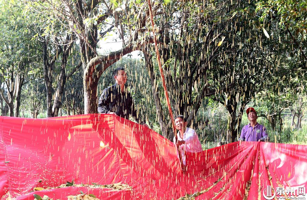 寒露时节,安溪县虎邱镇芳亭村花香四溢,村里数万棵桂花树迎来盛花期,当地农户趁着天气晴好忙着打收桂花,制作桂花茶、桂花糕、桂花酒等产品。(记者张九强)