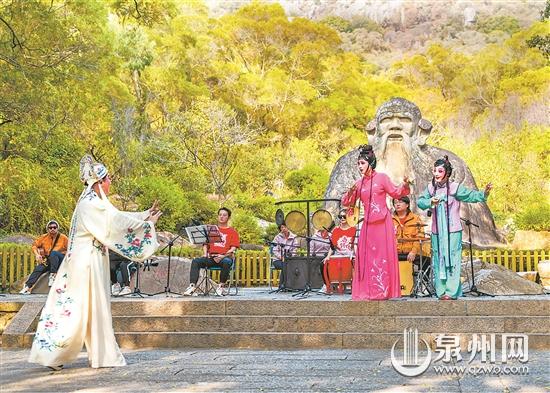 昨日下午,到泉州清源山游玩的市民游客,邂逅了一场特别的“千年老君岩 八百梨园戏——梨园戏沉浸式演出”。在老君岩前,一群由泉州“80后”“90后”梨园戏传承人和本土流行音乐制作人组成的年轻人,欢快演绎了梨园戏传统剧目《陈三五娘》和经典闽南歌曲,现场观众赞不绝口。 据悉,这是“泉州市优秀传统文化传承发展项目‘泉州十八景’沉浸式表演艺术”活动的首站演出,该活动由市委宣传部、市文旅局、福建省梨园戏传承中心主办。 (康荣彬 吴文理 摄) |