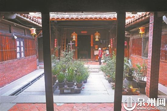 蔡氏古宅 在大隘门巷,蔡氏古厝是令人无法忽视的存在,无论是满墙的红砖红瓦闽南红,还是拱窗上的精美石雕,抑或是天井里留存百年的青草石,都告诉来者古厝底蕴厚重。走进厝内,天井里,绿株红花点缀了一方天地,置身其间,有种与世隔绝的宁静。 据《泉州古城踏勘》记载,蔡宅三开间加东护厝,原有三进,一、二进为传统民居,三进为中西合璧的砖混结构三层楼房,双坡硬山屋顶,典雅大方。蔡家儿媳妇曾淑慰说,古厝至今约百年,新中国成立后,三层楼房归属当时的“小市公安局”,一、二进基本保存尚好。这些年来,蔡家人守着古厝修修补补,让这一占地800余平方米的宅第岁月安然。 据记载,20世纪初南新马路(今中山南路)初辟,商人、华侨争购沿路官地,南门一带为黄金宝地,划为甲级地商业区,指挥巷口一带称为乙级地。清光绪末年,泉州人蔡锋瞅准商机,在泉州水巷购地开设“瑞裕行”,以代理亚细亚火油公司的石油起家,生意越做越大,成为泉州巨贾。