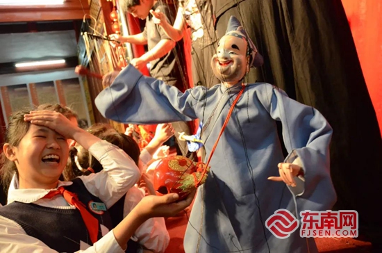 学校特意从泉州木偶剧团聘请4名专业教师入校为孩子授课 泉州市通政中心小学供图 东南网12月1日讯(本网记者 傅心玫 通讯员 施远圻)中华优秀传统文化是中华民族的精神命脉,学校担负着文化传承的重任,让中华文化展现出永久魅力和时代风采,是学校教育的重要内容。 上世纪90年代,泉州市通政中心小学与泉州木偶剧团共建合作,将国家级非物质文化遗产——泉州提线木偶引入校园,经过多年发展,这门古老的艺术在校园内“圈粉”无数,成为学校一大特色。在“十三五”国家社科基金重点项目——“艺术教育综合改革研究”中,该校被授牌为“提线木偶”特色实践基地校。 多学科普及 入校便知提线木偶 非遗进校园要怎么教?面对着大多数孩子对提线木偶“不知道”“不了解”的现状,学校创新传承思路,将木偶元素与语文、美术、音乐等多个学科相结合,用一堂堂木偶“跨界”融合课,开启孩子们对提线木偶的兴趣。 《玩偶大本营》这节美术课,是历届三年级学生最喜欢的一堂课,课堂上,美术老师教孩子们用卡纸、废弃布偶、易拉罐以及绳子等物料自制简易的提线木偶。通过动手制作,让孩子们知道木偶是如何被绳子牵引的。 “每一届学生上到这堂课,总能给我们带来不同的惊喜,制作出千奇百怪的提线木偶。”学校美术备课组组长陈鹏腾告诉记者,他们会针对学生不同年龄层特点,开设木偶绘画、木偶头彩绘、木偶头雕刻等课程。 “入校便知提线木偶!”六年级学生颜语回忆道,她是在一年级综合实践课上第一次看到提线木偶表演,当时,老师带他们到泉州木偶剧团观看演出。自那以后,颜语便喜欢上这门古老艺术,并在四年级学校少年宫课程中,毅然选择加入木偶社团。通过两年的学习,颜语从台下的观众变成了台上的表演者,“我最拿手的表演就是狮子,通过一丝一线来控制狮子的动作,可有意思了!”