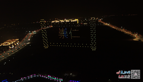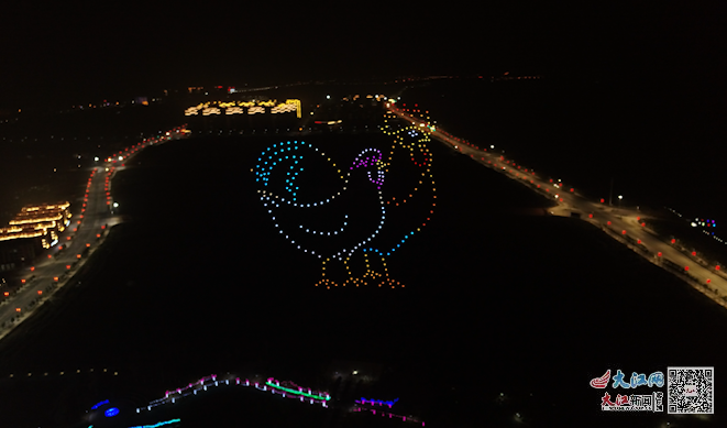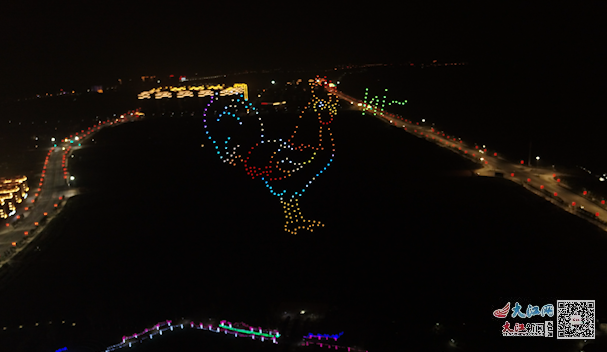 在现场的表演中,出场节目就非常惊艳,先是在夜空出现卷轴,卷轴缓缓打开,随后出现“崇仁”二字,画面栩栩如生,令现场观众称赞不已。接下来“崇仁麻鸡”登场,“麻鸡”在空中做运动状态,向现场观众打招呼,随后画面一转,变为一对相伴的麻鸡,向现场观众展现了“中国麻鸡之乡”的热情好客。