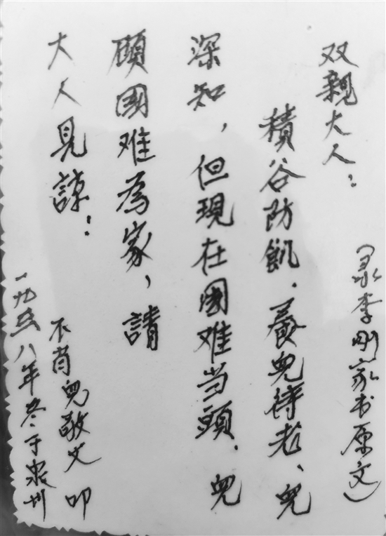 李刚寄给父母的家书,字字恳切。 107年前的昨天,也就是1914年1月11日,侨居马来西亚的南安诗山人李孔富,迎来了他的第6个儿子李刚。生逢乱世,因“为国家求生存,为民族求解放”的伟大理想,李刚的生命永远地停留在27岁。 李刚从小刻苦好学、博览群书,在古典诗词、书法等方面有很好的功底,但因家境窘迫,小学毕业后不得不远赴马来西亚谋生。求学若渴的他,一年后便返乡,于1931年考入泉州昭味国学。 “铁蹄蹂躏我神州。一代江山万种愁。不杀倭寇不除暴,苍天辜负少年头。”九一八事变发生后,17岁的李刚发出了这样的怒吼,毅然休学投身革命。同年冬,他在厦门由吕荣统等人介绍,加入党组织,并改名李刚。 在李刚故乡的南安市红旗小学校园内,建有一座李刚纪念馆,馆名题字落款为“许集美敬题”,“李刚同志是我青年时代参加革命斗争的一位十分重要的领路人。”泉州(县级市)首任市长、原福建省政协副主席许集美对李刚十分崇敬,“李刚同志是20世纪30年代中共闽中地区党组织优秀的领导人,在泉州地下革命斗争史上是一位关键性的人物,占有十分重要的分量。在反动派疯狂围剿、泉州党组织遭受严重破坏,环境极端险恶的情况下,始终不屈不挠地坚持斗争,起到了继承、恢复、发展泉州地区革命斗争事业的作用。” 1932年夏,李刚返回南安,参加安南永德地区革命斗争,组织农民运动开展抗捐、抗税、抗粮,打击土豪劣绅。1934年,中央红军主力撤离中央苏区长征后,国民党反动派开始大规模围剿革命力量,1934年—1935年间,“安南永”“晋南同”党组织遭受严重破坏,此时李刚临危受命,转移到“晋南”地区,恢复失去联系的组织,在南安、晋江的官桥、塔头、港塔等地恢复发展建立了一批党支部,使革命烽火重新燃起。 1937年6月—1939年7月,李刚先后担任中共晋南工委书记、中共泉州中心县委书记、中共闽南特委书记,领导泉州、莆田、福清党组织,广泛深入发动群众,开展声势浩大、形式多样的抗日救国运动。抵制日货,募捐支前,严惩汉奸……他广泛团结各界人士,建立“晋南抗日联乡自卫队”“妇抗会”“青年抗敌服务团”“抗日剧团”“抗日宣传队”等组织,又派地下党员掌握当时的《泉州日报》《抗日导报》等舆论阵地,在抗日运动中培养积极分子,发展党组织。