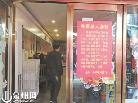 只要说遇到困难,就可以享用一顿“免费单人套餐”,这个开餐馆的人是出于什么想法?最近一段时间泉州不时降温,天气寒冷,但在城市的小小角落,总有一些人和事给人感动。近日,泉州的微信朋友圈中就流传着一张照片,在市区津坂路,一家餐馆为突然遇到困难的人提供免费的单人套餐,让他们能在寒冬里感受到温暖。【详细】