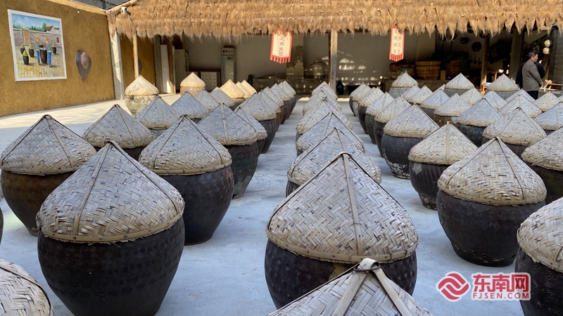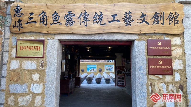 露天晾晒场,整排罐子里装满正在发酵中的鱼露。东南网记者 林杰 摄 回乡创馆 传承工艺 2019年,原本任教于江西科技大学的康勇坤放弃大学老师的身份回到家乡惠安创业。尽管之前父母都不同意康勇坤放弃原有的工作回来,但他义无反顾。从小耳濡目染鱼露传统工艺的康勇坤,回到家乡的第一件事就是建立起小岞镇首家三角鱼露文创馆。 这座取名三角鱼露传统工艺文创馆位于小岞镇前峰村,该馆原是小岞水产站的旧厂房,经过康勇坤细心改造而成。馆内主要展示小岞当地三角鱼露系列产品及其主要盐渍、发酵等传统工艺制作流程,全面介绍三角鱼露这项调味品工艺的传承历史。 走访该文创馆,一股鱼露味儿扑鼻而来,现场散发着浓郁的鱼腥味儿。占地近700平方米的平房里,左侧是12个2米深的三角鲀鱼发酵池,呈“田”字结构,容量高达1000吨,还配有惠女卡通形象展示“捕鱼、担鱼、盐渍、晒制、滤汁”的鱼露工艺制作流程。大门对面是露天晾晒场,整齐排列着近百个黑黝黝、盖着防雨竹编斗笠的大缸,大缸内装着发酵后经过初级过滤的鱼露,院子从里到外都散发着古早工艺的气息。院内,杆秤、蓑衣、斗笠、鱼篓等老物件随处可见。 “发酵、晾晒是三角鱼露传统制作工艺里必不可少的环节。”康勇坤介绍,传统的发酵工艺,时间可达三五年,短的至少也要一年半,这也是为保证三角鱼露的风味和营养成分。新鲜的三角鲀鱼在经过长时间的天然盐渍发酵后,就要转移到露天场地进行晾晒。只有在太阳下曝晒约一个月,才能充分释放鱼露的营养。 康勇坤说:“正宗、传统的工艺中只能用三角鲀鱼进行发酵,并且必须在制作工艺得当的情况下,发酵的时间越长营养价值越高。”