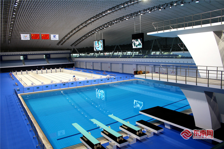 晋江市第二体育中心游泳馆包括跳水池、比赛池、热身池、戏水池及陆上训练区,建筑面积2.7万平方米,设置2000座观众席,可承办游泳、跳水、花样游泳、水球等国际单项比赛。 东南网记者 薛逸群 摄