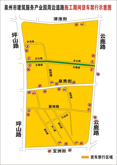 东南网4月26日讯(本网记者 潘贤利 通讯员 庄小强)记者从泉州市公安局交通警察支队丰泽大队获悉,根据丰泽区委、区政府的统一部署,泉州市建筑服务产业园(成洲工业区)周边环境将进行提升改造施工。为确保施工期间道路交通安全、有序、畅通,交警部门决定对部分道路进行交通管制。 管制时间为:2021年5月6日至2022年2月20日。管制路段及措施:津淮街坪山路至云鹿路路段以南(不含津淮街)、泉秀街坪山路至云鹿路路段以北(不含泉秀街)、坪山路津淮街至泉秀街路段以东(不含坪山路)、云鹿路津淮街至泉秀街路段以西(不含云鹿路)区域,禁止所有货运车辆通行。泉秀街坪山路至云鹿路路段以南(不含泉秀街)、宝洲街坪山路至云鹿路路段以北(不含宝洲街)、坪山路泉秀街至宝洲街路段以东(不含坪山路)、云鹿路泉秀街至宝洲街路段以西(不含云鹿路)区域,禁止所有货运车辆通行。交警部门将视施工进展情况对其他类型机动车进行适时管制。