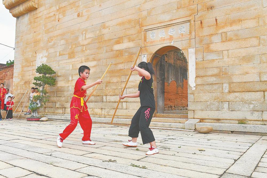 楼前石埕上,孩子们练习当地独有的罗家棍术。