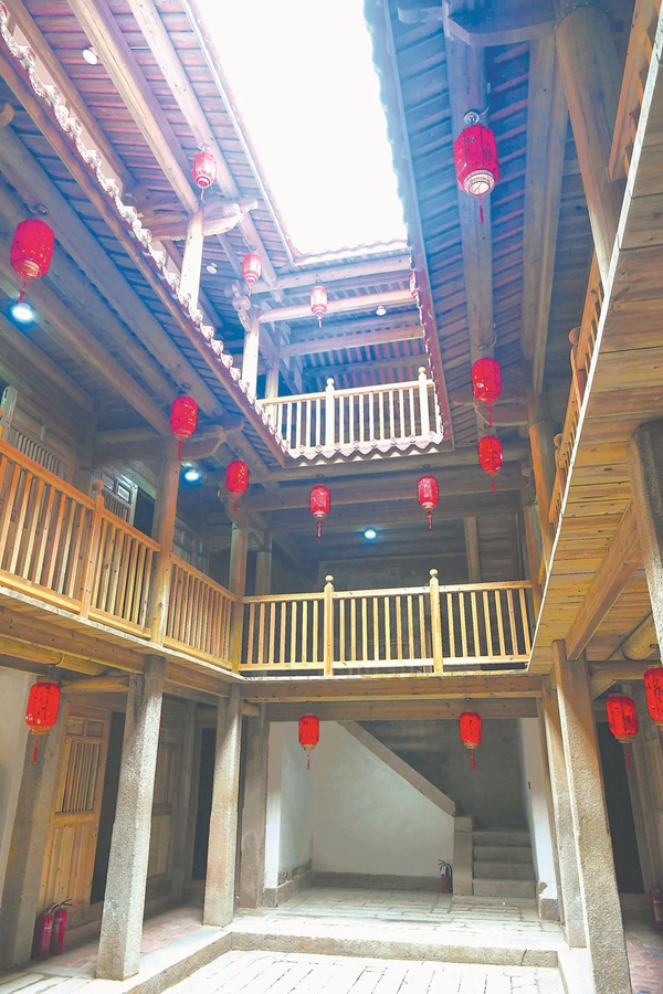 修缮后,在天井四周,沿栏杆廊道高高挂起红灯笼。
