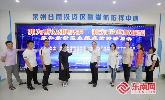 12日上午,泉州台商区党群工作部部长洪亚清(左五)与各媒体记者代表在指挥平台上共同按下手印,启动主题采访活动。泉州台商区融媒体中心 供图