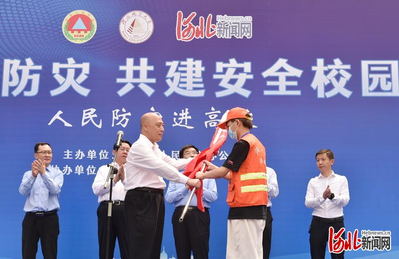 河北省人民防空办公室二级巡视员任玉芳为河北地质大学人防志愿者代表授旗。河北日报记者赵海江摄 启动仪式现场,省人民防空办公室二级巡视员任玉芳为河北地质大学人防志愿者代表授旗,30名地大学生加入到人防志愿者队伍。