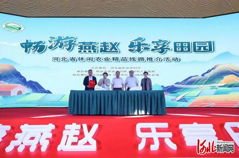 图为河北省休闲农业精品线路推介活动签约仪式现场。 许道宁摄 活动现场,播放了河北省休闲农业宣传片和“网红打卡地宣传”短片,集中展示了部分河北省休闲农业精品线路,举行了河北省入选全国“一村一品”示范村镇代表授牌仪式、全省休闲农业短视频大赛获奖代表颁奖仪式、旅游产品化开发签约仪式以及河北省休闲农业精品线路推介活动主办地授旗仪式。此外,为加快休闲农业资源向产品、产业转化,此次系列推介活动还根据每个休闲农业景点特点,经过专家调研、旅游OTA平台合作的形式,形成因地制宜、各具特色的产品化开发方案,为河北省休闲农业产业发展助力。在推介会现场,河北省农业农村厅农业产业化办公室与携程集团市场部达成了战略合作并签署合作协议,实现线上线下共同推介。