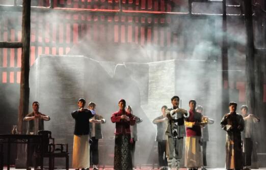 从色彩上来看,无论是舞台设计还是服装设计,音乐剧《上镇》主要突出的色调是白色、青色和红色,这三种颜色显然同瓷、烧瓷之火紧密相连。这也显然是男主人公火生、女主人公青花取名之由来。而在这三色之中,主创更加突出的是青色和红色。无需赘言,青与红这两种颜色在色彩学上是相互冲突的,我们在舞台、服装设计上很少会这么不加节制地使用这两种颜色。但是这两种颜色在这部剧里面却实现了一种形而上层面的和谐。因为这里的红色和青色不再是单纯的色彩本身,而是具有了隐喻和象征的意味,也就是说色彩本身寄托了某种精神价值。总之,音乐剧《上镇》中红色与青色、白色的共生共在,实际上隐喻性地构筑了瓷的基本品格和精神。 从场次设计来看,音乐剧包含了两个分别代表旧与新的空间,一边是传统,另一边是现代;一边是旧世界,另一边是新时代。但是观众在观看时,不会觉得这两者的衔接是生硬的。因为一方面是断裂、异质,另一方面则是绵延、承继。所谓断裂与异质指的是新旧政权、新旧世界的交替,而所谓绵延与承继则指的是一些内在精神的赓续,比如工匠精神、仁义精神、家国情怀等。可以说在新与旧、旧与新的转换过程中,《上镇》的设计极富新意。尤其是在旧世界向新世界的转换中,在巨幅红色的背景下,出现了一个吹号角的小战士,这个意象的使用简直是神来之笔,可以说不著一字,尽得风流。也正是因为这个意象的出现,音乐剧的立意和高度一下子就突显出来了,因为这再清楚不过地显现出,只有中国共产党领导的中国革命才是这从旧到新的唯一希望,也唯有在中国共产党的领导下,这“上镇”之“上”才会出现新气象、新格局。 从演与观的角度来说,《上镇》还常常使用戏仿、跳脱等方法来造成戏剧情境的暂停或者中断,这种暂停或中断某种程度上,使音乐剧的演与观形成了一种富有建设性的对话关系。比如在表现上个世纪30年代的历史中,演员在演唱中会忽然来上一句“爱情不是你想买想买就能买”,扮演鸨儿翠喜的演员突然说出“high”这样的单词,赖掌柜会突然会用景德镇方言来一段绕口令,等等。那么这种戏仿、借用、跳脱等手法,实际上就构成了布莱希特所说的“间离效果”。而这种间离实际上唤醒的是用历史来重新打量现实、让历史和现实进行对话的某种可能。