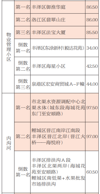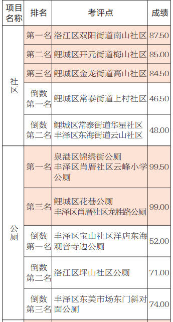 东南网6月1日讯(本网记者 薛逸群)记者从泉州市城管局考评中心了解到,4月份市城管局考评中心抽评92个(次)社区、96条主次干道、121个住宅小区、24座次集贸市场、10座便民市场、86座公厕、39个街旁广场、50段内沟河、5段江岸带,共发现问题7906处。经测算,各区考评总成绩排名如下:泉州开发区得分78.75分,排名第一;洛江区76.88分,排名第二;丰泽区72.95分,排名第三;鲤城区72.57分,排名第四;泉港区68.63分,排名第五。