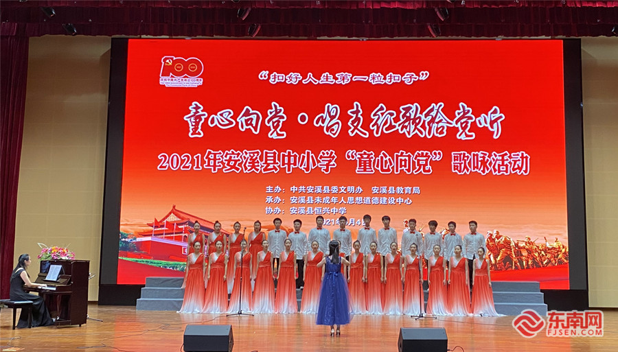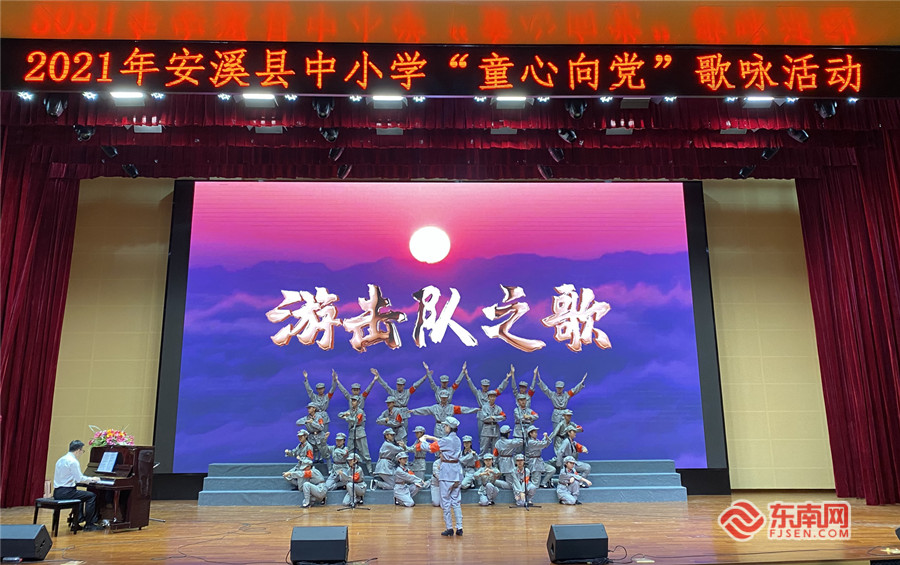 “童心向党·唱支红歌给党听”歌咏活动现场。 东南网记者 林杰摄 东南网6月5日讯(本网记者 林杰 通讯员 吴远景)6月4日下午,由安溪县委文明办、县教育局共同主办的2021年安溪县中小学生“童心向党·唱支红歌给党听”歌咏活动举行,来自全县有关学校的13支代表队参加汇演,传唱各类红色经典歌曲。 活动现场,一首《少年中国梦》拉开了歌咏汇演的序幕。紧接着,《追寻》《灯火里的中国》《游击队歌》《把一切献给党》《保卫黄河》等一曲曲耳熟能详的经典歌曲陆续唱响,学生们用歌声展示了知党爱党、永听党话、永跟党走的精神风貌。演出气氛欢快热烈,激昂向上,充分表达了全县广大中小学生对党、对祖国、对人民的热爱之情,赞颂新时代、新生活。 为庆祝中国共产党成立100周年,今年以来,安溪县各级各类学校纷纷组织开展形式多样的“童心向党”教育实践活动,重温党的百年历程,引导未成年人铭记革命先烈光荣事迹,倍加珍惜今天幸福生活,不断增进热爱祖国、热爱人民、热爱中华民族的情感,树立人生志向。