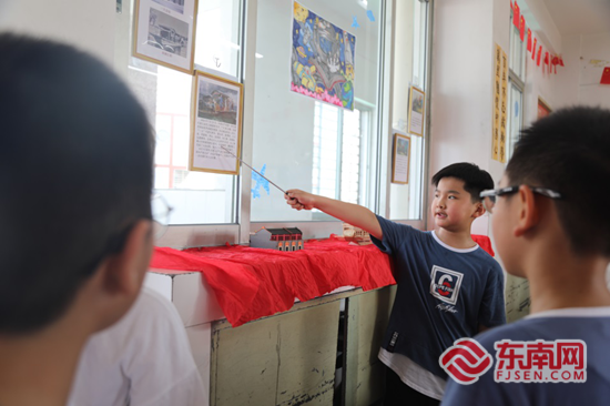 学生在教室介绍党史故事。鲤城区融媒体中心 供图 东南网6月16日讯(本网记者 陈诗婷 通讯员 施远圻)“1921年7月,中共‘一大’在上海秘密召开,后因法租界巡捕搜查被迫休会。‘一大’代表们转移到浙江嘉兴,最终在一艘游船完成会议议程。”课间休息,泉州市第二中心小学“中国腾飞馆”小讲解员林子豪绘声绘色地向同学们讲述“南湖红船”的故事。 这个“中国腾飞馆”并不是学校建设的场馆,而是林子豪就读的三年一班班级教室。原来,4月初学校党支部组织开展了“班班都是党史学习教育馆”活动,由各班老师确定主题,学生准备展馆内容,师生、家长共同布置,让一间间教室变成一个个“迷你”版党史展馆。 同样来自三年一班的蔡煜阳同学是个军事爱好者,平时喜欢了解军事武器知识,拼装模型。在班级展馆主题确定为“中国腾飞馆”后,他便决定“贡献”出自己最心爱的“辽宁舰”,“我用了3个多月才拼装完这个模型,是我所有模型中最大、最重的一个,每次拼装时我都为祖国日益强大感到自豪!”蔡煜阳说,他希望通过分享最心爱的模型,和同学们一起感受祖国奋进的力量。