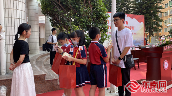 小同学们向返校的优秀学长学姐请教学习心得。东南网记者 林杰 摄 活动中,学校举行了“筑梦园”揭幕仪式。据介绍,筑梦园是学校梦想起航的地方,由惠安爱心企业家王惠坚出资捐建,于今年8月23日落成。主体雕塑造型为打开的书卷,以金印章的形式,用篆刻艺术展现了中国共产党成立100年的光辉足迹。雕塑表面的流金数字,讲述着每一个8.23,每一串红色的印迹。园区另一主题雕塑“强国有我”,以数字823为构想设计造型,寓意八二三学子有“强国有我”的决心和力量,有“请党放心”的信心和担当。 八二三实验小学校长郭惠彬表示,整个筑梦园成了校园文化 “梦系列”又一特色景观,它与此前学校设立的“幸福追梦”浮雕主题文化墙、“圆梦长廊”形成一个完整的特色文化品牌,共同彰显全体八二三人潜心筑梦、幸福追梦、快乐圆梦的教育追求。学校将以“厚植八二三特色文化 实现八二三品牌发展”为新学年工作主题,传承红色基因,推进教育创新,努力创建全国文明校园。 据介绍,每年8月23日,惠安县八二三实验小学都会举行“八二三返校日”活动,铭记八二三实小建立的特殊意义。1949年8月23日是惠安解放的日子。1999年,为纪念惠安解放50周年,惠安县第二实验小学更名为“惠安县八二三实验小学”。建校伊始,学校就注入浓烈的红色基因,绘就红色教育的底色,红色的荣光薪火相传。