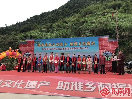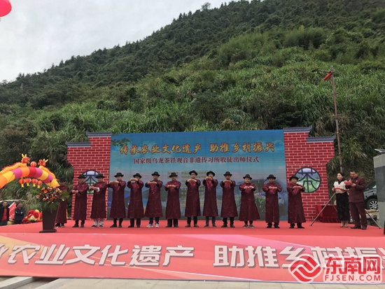 东南网10月24日讯(本网记者 潘贤利 陈培源 通讯员 张锦川)“出师了、出师了、我们出师了……”24日上午,在中国乌龙茶铁观音的发源地安溪西坪镇,国家级乌龙茶铁观音非遗传习所的5名学徒正式出师,他们挑着出师担,环绕现场。 当天,由安溪县茶业管理委员会主办的“传承农业文化遗产 助推乡村振兴”国家级乌龙茶铁观音传习所收徒出师仪式,在安溪西坪茶禅寺举行。 活动一开始举行简朴的敬茶仪式,安溪铁观音大师和中国制茶大师魏月德、李金登、刘协宗、李力周、李凯林、詹玉炎、杨木山、刘文品、陈春、李加鸿、刘协明、林森泉、谢振邦、林辉毅上台,举起手中的茶杯集体敬茶。 乌龙茶铁观音制作技艺是国家级非物质文化遗产。乌龙茶铁观音制作技艺需要一辈子去学习、领悟,更需要名师的传帮带。位于安溪县西坪镇的国家级乌龙茶铁观音非遗传习所自2015年创办以来,在国家级非遗传承人、中国制茶大师魏月德的热心指导下,大力开展技艺传承活动。24日,又招收一批学徒和出师一批学徒。