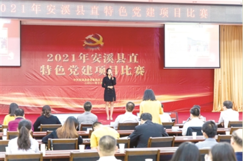 22日,安溪县举行2021年县直机关特色党建项目比赛。18个参赛单位结合PPT,紧紧围绕“创模范、当先锋、XIN服务、优环境”的主题,比创新、晒亮点、拼特色,全方位展示机关党组织和党员干部服务民生、服务群众的做法和经验。经过激烈角逐,最终由宣传系统选送、县融媒体中心党支部汇报的“融媒聚力党旗红”获得一等奖。(安溪报记者 叶超)