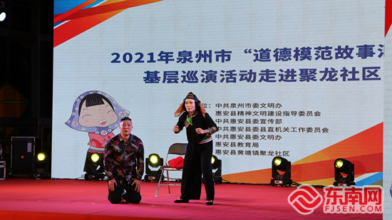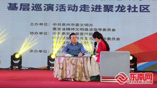福建省道德模范林和辉(左一)现场分享。 东南网记者 施远圻摄 感受好人事迹 社区居民深受启发 动人的歌曲《文明在哪里》、模范故事小品《红围巾》、富有当地特色的四重唱《惠安月》……活动现场,多个精彩的节目轮番上阵,吸引了现场观众的眼球,引来阵阵掌声。 小品《红围巾》是以道德模范陈欠水为原型创作的,而快板《见义勇为美名扬》则是以见义勇为英雄杨福成、曾阿煌为原型创作的。一系列节目用表演的形式将道德模范、见义勇为英雄的事迹介绍大家,获得了大家的好评。 “这样接地气的演出非常有意义,我们都非常喜欢,在观看演出中,大家的观念上能受到好人事迹的启发,坚定了互帮互助、多做好事的信念。”聚龙社区居民陈先生告诉记者,他用手机记录下精彩的节目瞬间,以后可以和身边人分享心得。 本次活动由泉州市委文明办、惠安县文明委主办,惠安县委宣传部、县直机关工作委员会、县委文明办、县教育局承办。