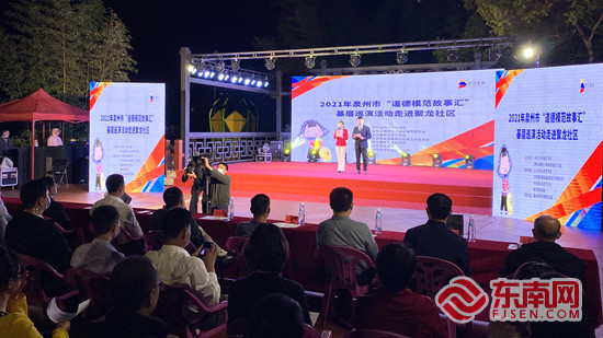 福建省委宣传部副部长、文明办主任陈添贵(右一)为全国文明社区聚龙社区授牌。 东南网记者 施远圻摄 东南网11月2日讯(本网记者 施远圻 林杰)11月1日晚上,2021年度泉州市“道德模范故事汇”基层巡演活动在惠安黄塘镇聚龙社区举行。活动上,省委宣传部副部长、文明办主任陈添贵为全国文明社区聚龙社区授牌。省道德模范陈欠水、林和辉两位同志做现场分享。