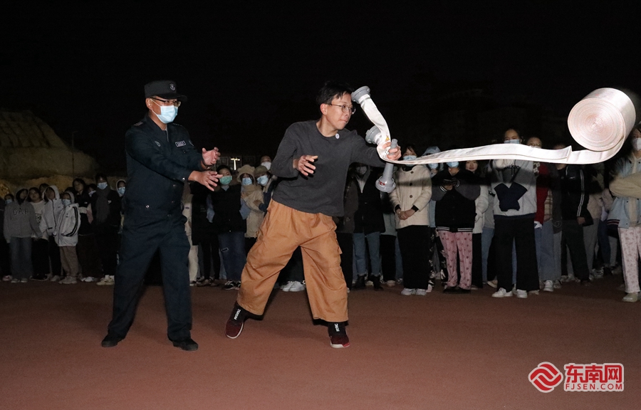 现场介绍水枪铺设和使用方法。 东南网记者 陈培源 摄 东南网12月2日讯(本网记者 陈培源)1日晚,为应对突发事件,提高师生应急防护救助能力,泉州幼高专外语旅游学院在东海校区开展消防应急演练。 演练信号发出后,各演练组按照预先设定的路线有序开展,疏散工作组在每层楼都安排辅导员引导学生疏散,合理调节学生疏散的进度,防止过度拥挤造成踩踏事故。 据泉州幼高专保卫处负责人介绍,学校保卫处每个月都会对安保人员和消防人员开展训练,强化应急反应和处置能力。此次在夜间开展应急演练,也是为了增强师生夜间逃生的本领和能力,积累集体疏散、应急组织等实战经验,提高师生夜间应急防护救助能力,强化安全意识,完善预警机制。 “我们学校每年差不多举行两次规模比较大的演练,上次是在春季。”来自休闲体育专业20级学生徐志洪认为,经常组织应急演练很有必要,让同学们都参与其中,能够牢记疏散线路,在紧急时刻来临的时候更能从容应对,有序逃生。 应急疏散演练开始前还对师生进行培训,进行防火、防震安全知识宣传和安全逃生教育,介绍应急避震减灾自救方法,介绍演练程序和应急避震的正确方法,熟悉避震和疏散的演练信号、疏散路线和集合地点。