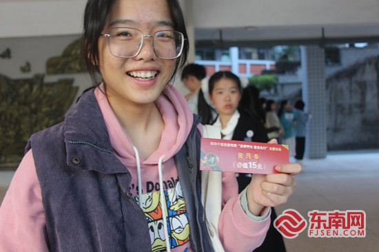 学前教育专业学生王钦兴奋地向记者展示她在有奖竞猜中获得的面包券。东南网记者 谢玉妹 摄
