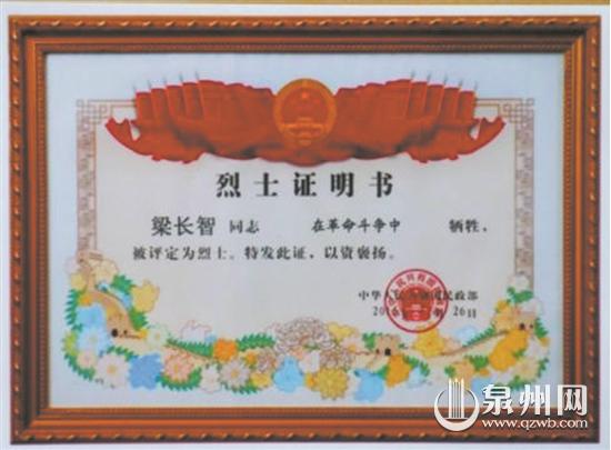 梁长智烈士证明书 1949年1月,中共泉厦临工委决定以龙门为依托,以长坑为中心,在安(溪)、永(春)、德(化)、漳(平)地区开展武装斗争。在安溪长坑白石开办游击队训练班,梁长智被选为游击队总部通讯员,负责来往于安溪长坑与南安、同安之间,传递消息。 1949年5月初,中共安溪中心县委领导安溪游击大队进攻安溪县城,安南同游击队同时也在进行解放安溪官桥的战斗,梁长智奔波在安溪县城与官桥、蓬莱几地间传达信息。5月4日凌晨,官桥的国民党军残敌据守官郁土楼负隅顽抗,安南同游击队围攻持续了数日仍没有攻下,便决定派人去蓬莱取炸药爆破,强攻土楼。梁长智自告奋勇领取这一任务,与另外4位同志从官桥赶赴蓬莱取炸药。5日,他们携带炸药,从蓬莱返回官桥途中,经乌东格白沙亭时,与敌人发生遭遇战,梁长智等5位同志战至弹尽,壮烈牺牲。 梁长智牺牲后,安南同县工委报请中共安溪中心县委批准,追认其为中国共产党党员。“1949年5月2日,我五哥到我嫁到官桥的二姐梁惜家中换衣服,换了一身中山装就离开了,当时我也在我二姐家。那是我们最后一次见他,当时他才19岁。我们留下的唯一一张他的照片,是他13岁时拍的,还一脸稚气。”梁仲英哽咽地说。 |