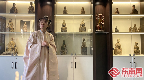 一瓣香妈祖文化展览馆馆长孙子璇介绍妈祖古造像,该展馆迄今收藏了近千尊妈祖造像。东南网记者 林杰 摄 |