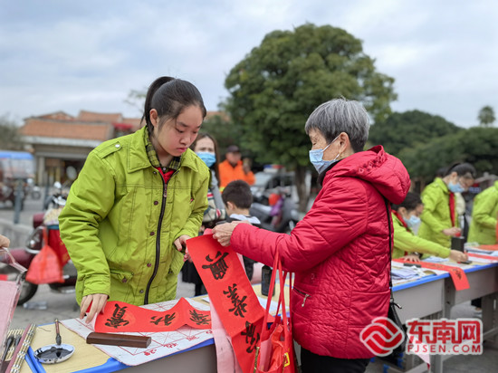 市民从学生手上领取春联。 学校 供图 东南网1月24日讯(本网记者 施远圻)可爱的虎年“福”字、寓意吉祥的春联、精彩的世遗景点讲解……临近春节,泉州市鲤城区实验小学党支部牵头组织学校少先队员在德济门遗址前开展“文化惠民 真情暖您”移风易俗过大年志愿服务活动,在世遗景点旁边向市民、游客送去新春祝福。 据了解,该校已连续四年在春节前举办送春联活动,今年是第一次在世遗景点——天后宫、德济门遗址周边开展。“申遗成功后,两处世遗景点吸引不少市民、游客打卡,我们希望将祝福送给更多人。”学校少先队总辅导员吴娴介绍道,学校还组织“红领巾小讲解员”带游客参观世遗景点,让游客们了解福建文化。 爱心送“虎”福 墨香暖人心 “小朋友,可以帮我写‘出入平安’的横批吗?”“这个福字好可爱,下面是只小老虎,我也想要。”德济门遗址前,学校师生挥毫泼墨、书写祝福,吸引不少市民前来围观,领取春联。 这是陈泓发同学第二次参加送春联活动,他最喜欢自己写的“和顺一门有百福,平安二字值千金”这副对联。“我觉得‘有百福’这个寓意非常好,我也希望拿到这副对联的爷爷奶奶们一家人在新的一年能有好福气。”陈泓发告诉记者,今年他打算在自家门口也贴上同样内容的春联。 “我们在写春联,书法老师还创作出可爱的‘福’字,老师把‘福’字右下方的‘田’字变成小老虎的图像,非常有趣。”四年级学生陈卿瑜告诉记者,第一次参加送春联活动的她感觉非常有意思,希望明年还能参加。 一幅幅有新意的“福”字,也吸引不少来天后宫、德济门遗址游玩的游客驻足观看、领取,“有四名来自北京游客特意排队领取一副对联和‘福’字,那位北京老奶奶说希望把代表泉州的‘福’带回北京。”吴娴说。 |