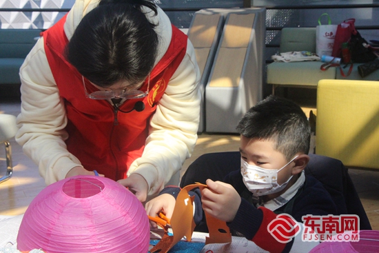 志愿者在一旁指导孩子制作花灯。东南网记者 谢玉妹 摄