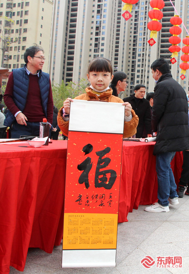 小朋友展示活动现场赠与的“福”字挂历图。 东南网记者 林杰 摄 |