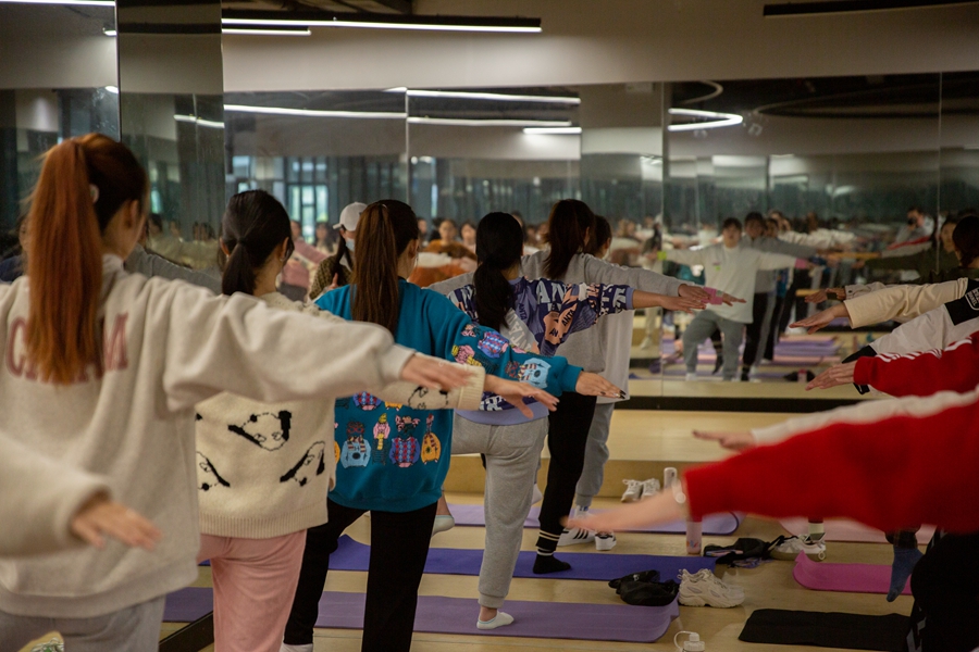 在文化旅游与体育学院的综合操房,普拉提课堂老师郑玲玲站在整面墙的镜子前方,单脚独立、扬起双手,轻轻地一呼一吸。学生们模仿着郑老师的动作,伴随她的口令“吸气、呼气……”调整呼吸,渐渐让呼吸与动作协调起来。