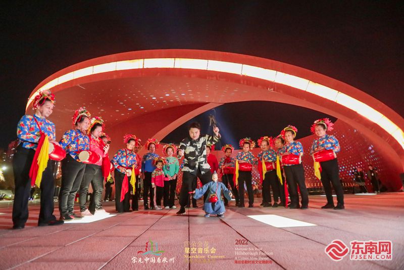 古今融合,为观众呈现出别具一格的演出。东南网记者 谢玉妹 摄 此外,演奏乐队通过对《爱拼才会赢》《随缘》等经典曲目的全新演绎,展现出泉州朝气蓬勃的文艺新气息;《梨园戏十八步科母》为观众带来美妙的梨园戏七大行当的科步展示;《万疆》祝愿祖国繁荣昌盛;《蓝蓝泉州湾》唱出泉州人民海纳百川、敢拼会赢的气魄…… 一首首耳熟能详的歌曲引起了现场观众的共鸣。“梨园戏的声音一出来,我就感觉非常悦耳动听,这种全新演绎、老歌新唱的方式很独特。”住在附近小区的泉州市民石女士当晚特地带着孩子来观看演出。石女士认为,这是一种很好的艺术形式,能让更多的市民参与其中,也能让住在新区的小朋友从小受到传统艺术的熏陶。 “这种演出方式很有泉州特色,能唱出泉州人自己的声音!”在获悉演出信息后,新泉州人潘女士与朋友们结伴前来观看,她直言,希望泉州能在各个不同地方多举办类似演出,让更多泉州市民和外地游客听到“尚好听”的泉州音乐。 “梨园戏是在泉州‘土生土长’的戏曲,已有800年的历史了,这几年,我们开始尝试古今融合的新表演形式,有了不一样的呈现。”福建省梨园戏传承中心的青年演员廖淑云从13岁开始学习梨园戏,对这项闽南传统戏曲有着深厚的感情。“希望传统艺术与流行艺术的碰撞能带来不一样的火花,能更多元地展现梨园戏,让更多年轻观众知道,虽然这种戏曲很古老,却蕴含着蓬勃生命力,也可以很时尚。”