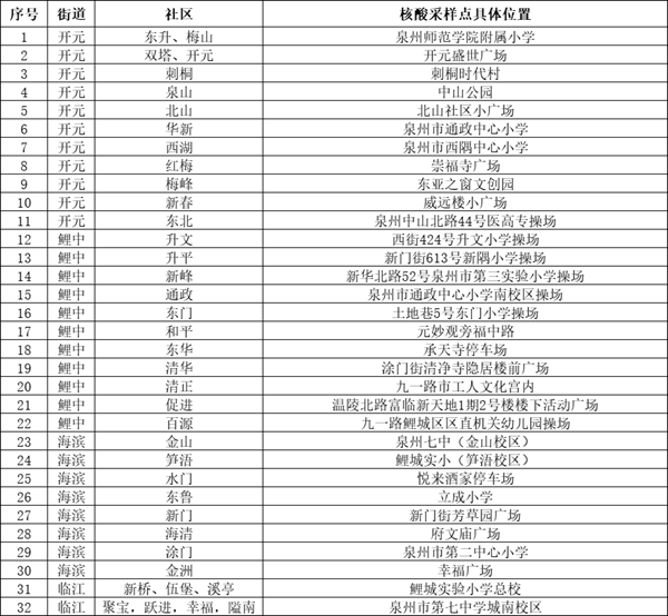 鲤城区防控新型冠状病毒感染的肺炎疫情应急指挥部通告 (2022年第1号) 3月13日上午,丰泽区在对“应检尽检”人群进行新冠病毒核酸检测中,初筛发现9人呈阳性,经泉州市疾控中心复核为阳性,均为丰泽区滨海酒店工作人员。 根据全市统一部署,鲤城区立即启动疫情防控应急处置机制,全面开展流行病学调查、采样检测和隔离控制,严格落实相关场所管控及环境消杀等防疫措施,对各类相关人员排查、检测、管控等工作均在全力进行中。后续相关信息,区疫情指挥部将及时发布,请广大市民群众做到不信谣、不传谣、不造谣。 请2月27日以来到过丰泽区滨海酒店的人员,第一时间向所在社区和单位报备,配合防控措施。请广大市民群众持续提高防范意识,科学佩戴口罩,勤洗手、常通风、保持一米以上社交距离,不扎堆、少聚集,保持良好卫生习惯和饮食习惯,主动配合落实各项疫情防控措施。如出现发热、咳嗽、腹泻、乏力等症状,要及时到就近的发热门诊进行排查和诊疗,就医过程要佩戴一次性医用口罩及以上级别口罩,就医过程中不得乘坐公共交通工具。 鲤城区防控新型冠状病毒感染的肺炎疫情应急指挥部 2022年3月13日 鲤城区防控新型冠状病毒感染的肺炎疫情应急指挥部通告 (2022年第2号) 为切实保障人民群众生命安全和身体健康,把风险降到最低,我区即时启动新冠病毒核酸检测。现将有关事项通告如下: 一、2月27日以来到过丰泽区滨海酒店的人员立即前往江南医院侧门口(中骏四季阳光这一侧)核酸检测点进行核酸检测。 二、在鲤城区开元、鲤中、海滨、临江四个街道行政区域内居住生活的所有人(包括常住人口、暂住人口、临时流动人口、外籍人口等),不含集中和居家医学观察人员,请按照所在社区工作人员的通知指引,分时段有序到达指定地点开展核酸采样。外来商务人员就近参加核酸检测。目前居住在本辖区以外的居民就近到居住辖区核酸检测点检测。 三、检测时间:即刻起。 四、注意事项: 1.请携带身份证(无身份证者请携带户口簿)等有效身份证明,到达指定地点参加采样。检测过程中请主动配合、听从工作人员指挥。 2.采样期间请做好个人防护、全程佩戴口罩,并保持一米以上距离,避免聚集和相互交谈,自觉维护好现场秩序。采集完后,立即戴好口罩并尽快离开现场。 3.不参加核酸检测将会给您的生活带来诸多不便,无正当理由拒不配合、妨碍疫情防控、造谣传谣或造成其他严重后果的,将依法依规追究相应法律责任。 4.辖区各机关、企事业单位必须无条件支持,并督促员工在上述规定时间内参加核酸检测;各出租户房东要履行督促责任,提醒、通知租户参加核酸检测。 核酸检测,人人有责!为了大家生活更便利、更美好,请辖区居民相互转告,注意做好防范,按时参与本轮核酸检测! 鲤城区防控新型冠状病毒感染的肺炎疫情应急指挥部 2022年3月13日 鲤城区开元、鲤中、海滨、临江街道核酸采样点