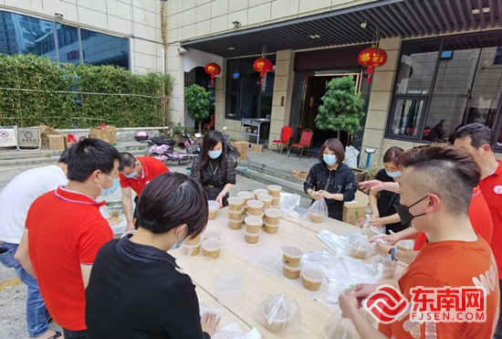 石狮市餐饮烹饪行业协会人员正在为核酸检测工作人员配送食物。石狮宣传部 供图 爱心餐温暖战疫一线。3月16日,石狮市餐饮烹饪行业协会组织发动会员企业爱心接力,分别向市区及镇村10多个核酸检测采样点为奋战在疫情防控一线的医务人员、工作人员、志愿者等赠送午餐(咸饭及汤)500余份,晚餐(鸭仔粥、深海鱼粥)1000份。