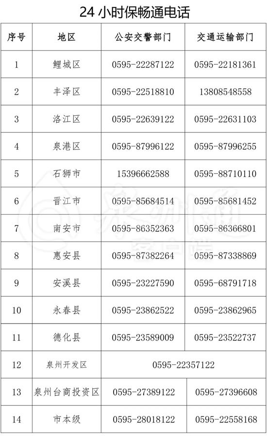 泉州市防控新型冠状病毒感染的肺炎疫情应急指挥部2022年7号通告 为保持群众生产生活平稳有序,统筹做好疫情防控与交通运输保畅通工作,现就有关事项通告如下: 一、自2022年3月19日0时起,中心市区交通查验点调整如下: 1.洛阳江大桥节点(城西大道与G324交叉口) 2.后渚大桥节点(东西主干道与洛沙大道交叉口) 3.晋江大桥节点(江滨南路一侧互通) 4.刺桐大桥节点(原收费站) 5.田安大桥节点(进城江滨南路一侧,出城江滨北路一侧) 6.江滨南路与望江路节点(进城晋江一侧,出城鲤城一侧) 7.泉州大桥节点(进城南迎宾大道上桥匝道、泉安北路上桥匝道,出城温陵路与宝洲街交叉口) 8.顺济新桥节点(浦口环岛) 9.兴贤路节点(西渠路口) 10.南环路节点(明发酒店附近) 11.池峰路节点(玉泉南街以南) 12.凌霄路节点(凌霄中学附近) 13.南环路与江南大街节点(柳中路一侧) 14.江滨南路与金霞路交叉口节点 15.江滨北路与黄龙大桥交叉口节点 16.省道307与黄龙大桥交叉口节点(招联路口) 17.站前东西大道节点(天元未来城路口,进城南安一侧,出城丰泽一侧) 18.省道312节点 19.马甲镇节点 20.安内村节点 21.省道213节点1(往南安方向) 22.省道213节点2(往仙游方向) 23.花溪山节点 24.园岭线节点 25.梧峰村节点 26.联三线节点 以上节点均为进出城双向查验。 管控区范围内其他区域由各地根据实际情况设点,形成闭环。 二、通行要求 1.居民非必要不离开中心市区,确需离开的,须凭健康码绿码并持有48小时内核酸检测阴性证明。 2.保障医疗防控物资、鲜活农产品、重点生产生活物资、能源物资、邮政快递等各类重点物资运输车辆快速便捷通行。 3.市、县两级设置24小时保畅通电话,及时帮助协调解决物资运输和老弱病残孕应急通行问题。 附件:24小时保畅通电话